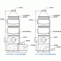 結(jié)構(gòu)形式:本設(shè)備分單塔體和雙塔體。采用圓形塔體,用法蘭分段聯(lián)接而成。具體由貯液箱、塔體、進(jìn)風(fēng)段、噴淋層、填料層、旋流除霧層、出風(fēng)錐帽、觀檢孔等組成。